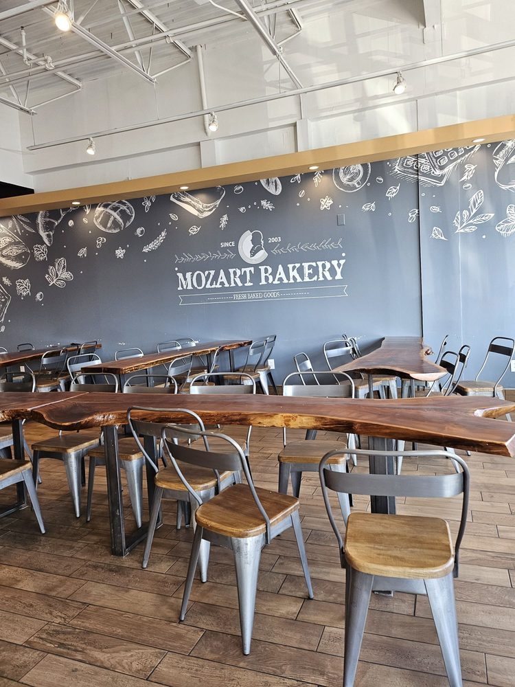 Mozart Bakery & Cafe offers amenities such as Outdoor Parking, Parking Lot, Good for Kids, Wi-Fi, Accepts Credit Cards, Accepts Contactless Payments, ensuring a comfortable and convenient experience for clients.